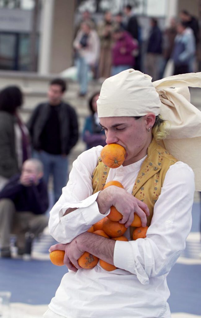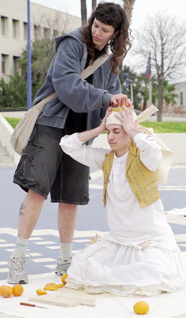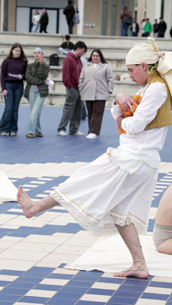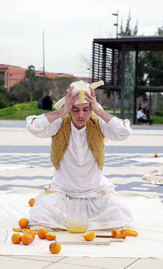 “És una performance participativa que parla sobre l’autonomia alimentària. A través d’ella reflexionem entorn de l’origen dels aliments, com molts d’estos que ingerim recorren moltíssims quilòmetres fins a arribar a nosotres i el valor que li donem al producte local i als agricultors que treballen la nostra terra.”